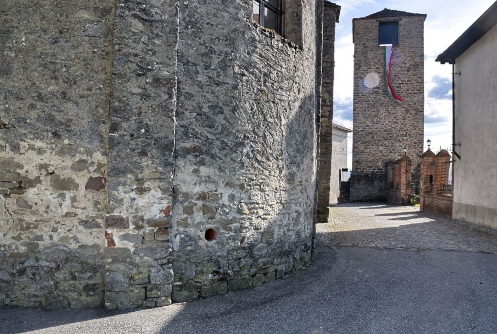 Alle spalle della torre si snoda l’abitato medioevale a forma triangolare, chiuso a sud da una torre-porta (attualmente in fogge del XV sec.) detta oggi “Arco dei Francesi” a ricordo del passaggio della divisione di Laharpe durante la napoleonica Campagna d’Italia del 1796.